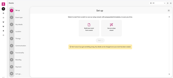 - Choose whether you want to clone a previous event or start from scratch using our set up wizard. *If you select the setup wizard, you will be asked to select your event type e.g Golf Day or Gala Dinner.