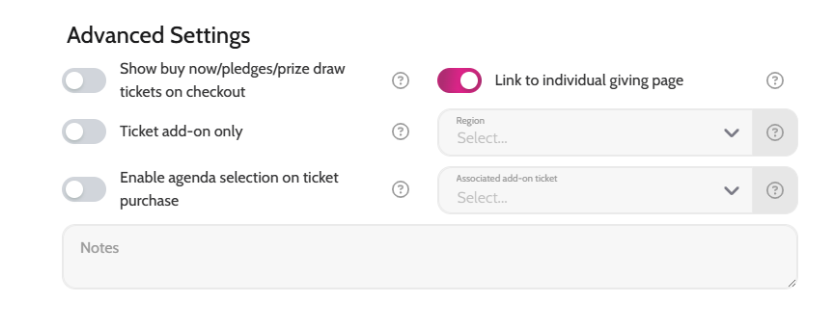 - "IMPORTANT: make sure when creating the ticket that you go to "Advanced settings" and turn on "Link to Individual Giving Page"