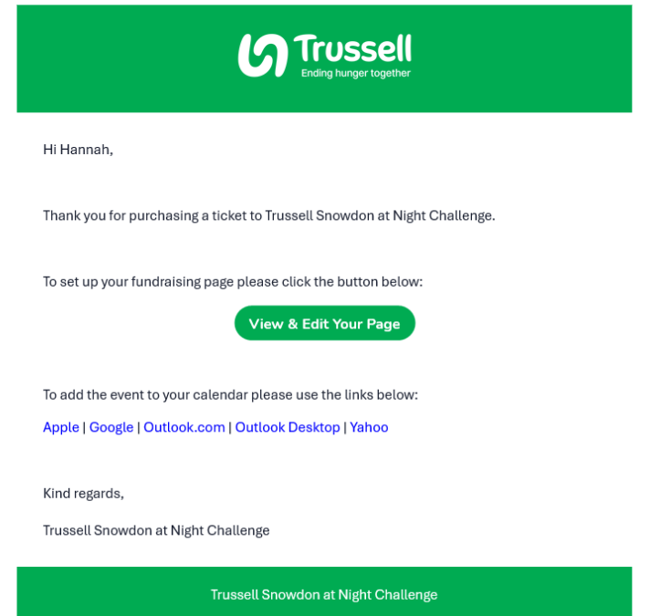 - Participants will then receive the customised “Event Ticket Confirmation – Individual Giving Page Linked” email (that you have customised) to confirm their place and encourage them to set up their fundraising page via a link