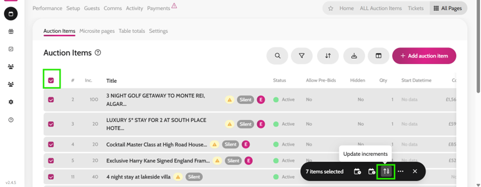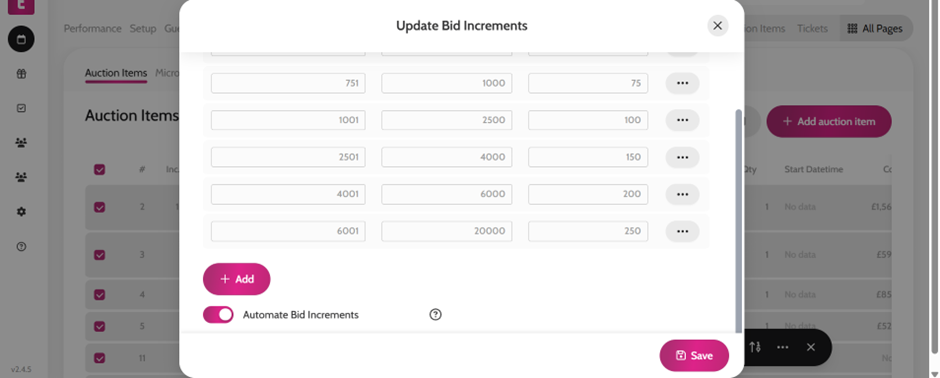 You can set customised levels for the auction items so their increments update automatically as bids are placed on the items, allowing you to raise more funds.